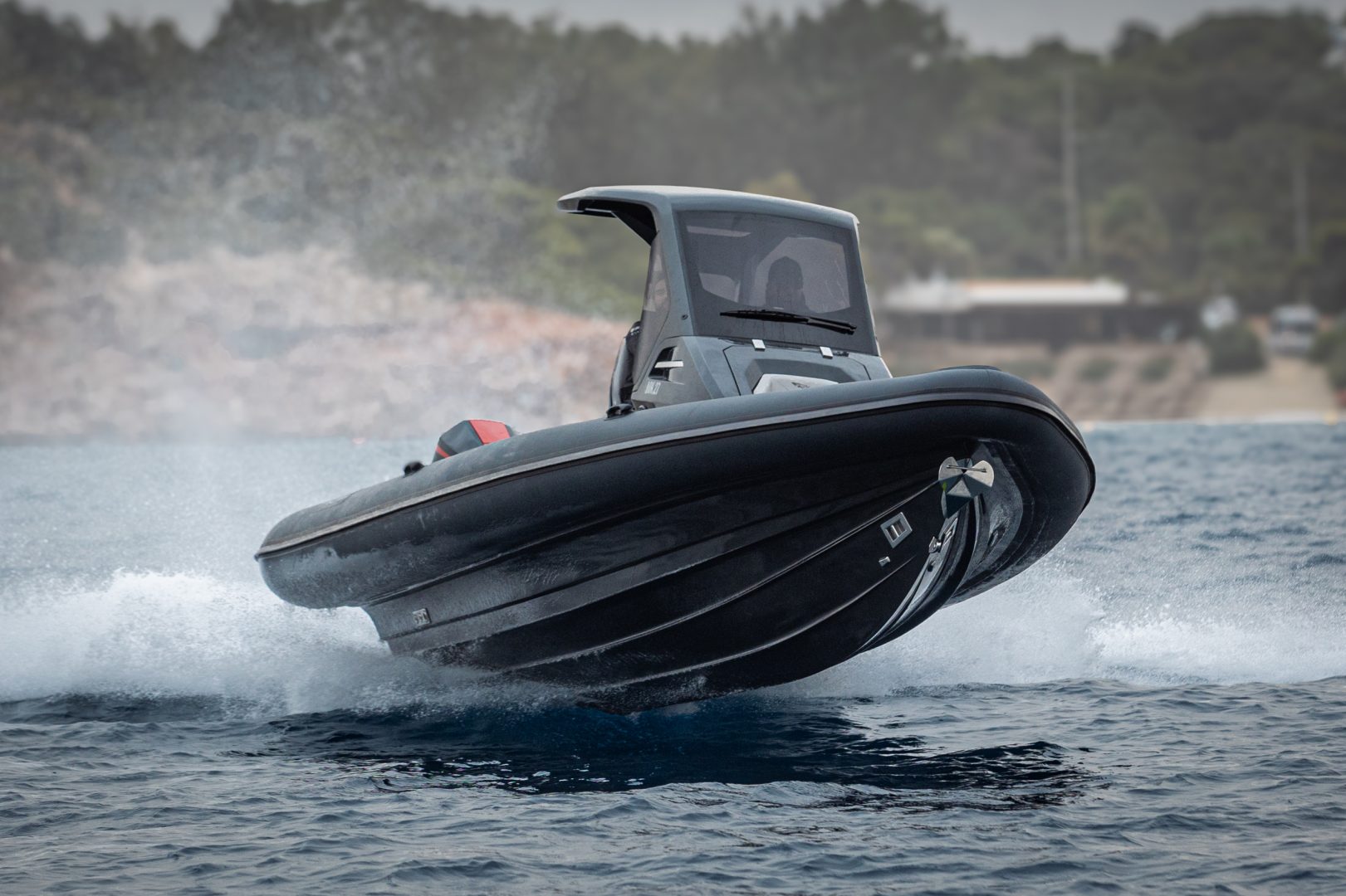 Venom 40 SC is the newest development in the 12m segment. The design is unique yet recognizable as a RIBCO. The addition of a cabin worked positively, creating a unique sleek design. It combines the space of an open model of this size with the added comfort of a big cabin for 2 and a full-size toilet with shower, along with very well designed natural and ambient lighting. On the stern, a U-Shape couch with a back-to-back couch makes a cozy place for more than 7 people. On the console station, 5 people can travel seated safely with full protection from wind and spray. At the bow area, a big sunbathing couch facing forward is combined with the classic bow sunbed, creating a huge area for those who love the sun and tanning.